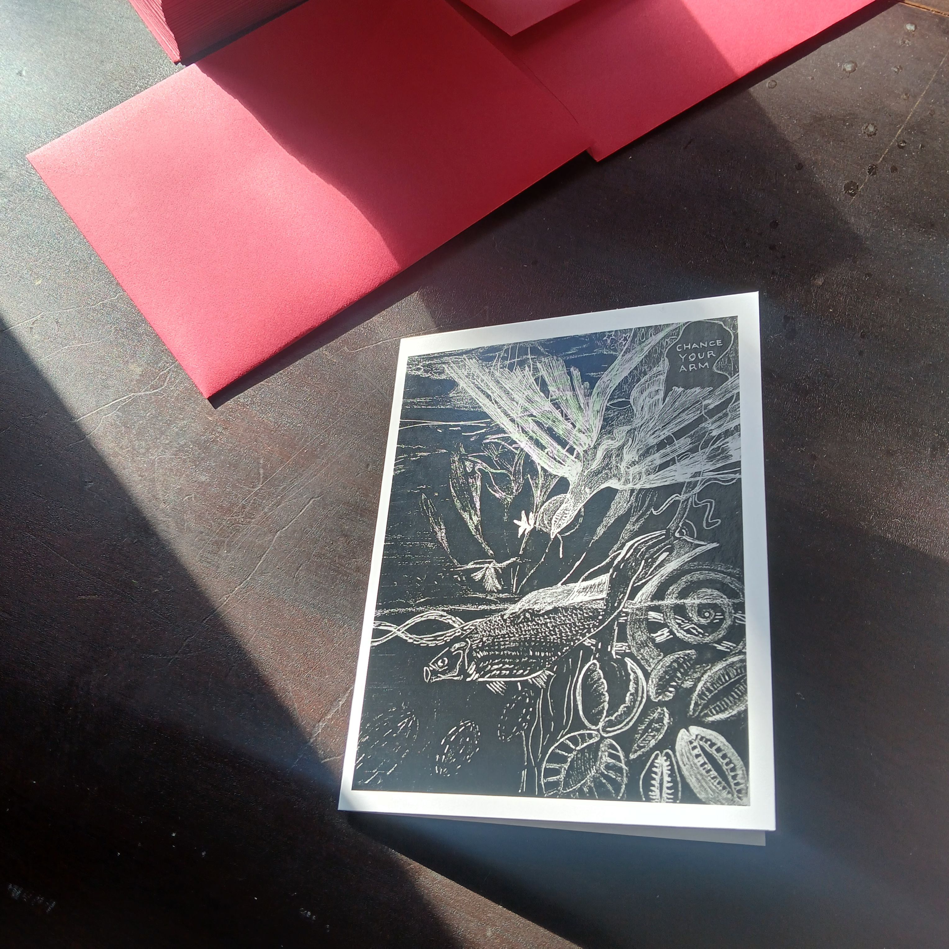 4″×5.25″ , hi gloss b&w + red envelope.